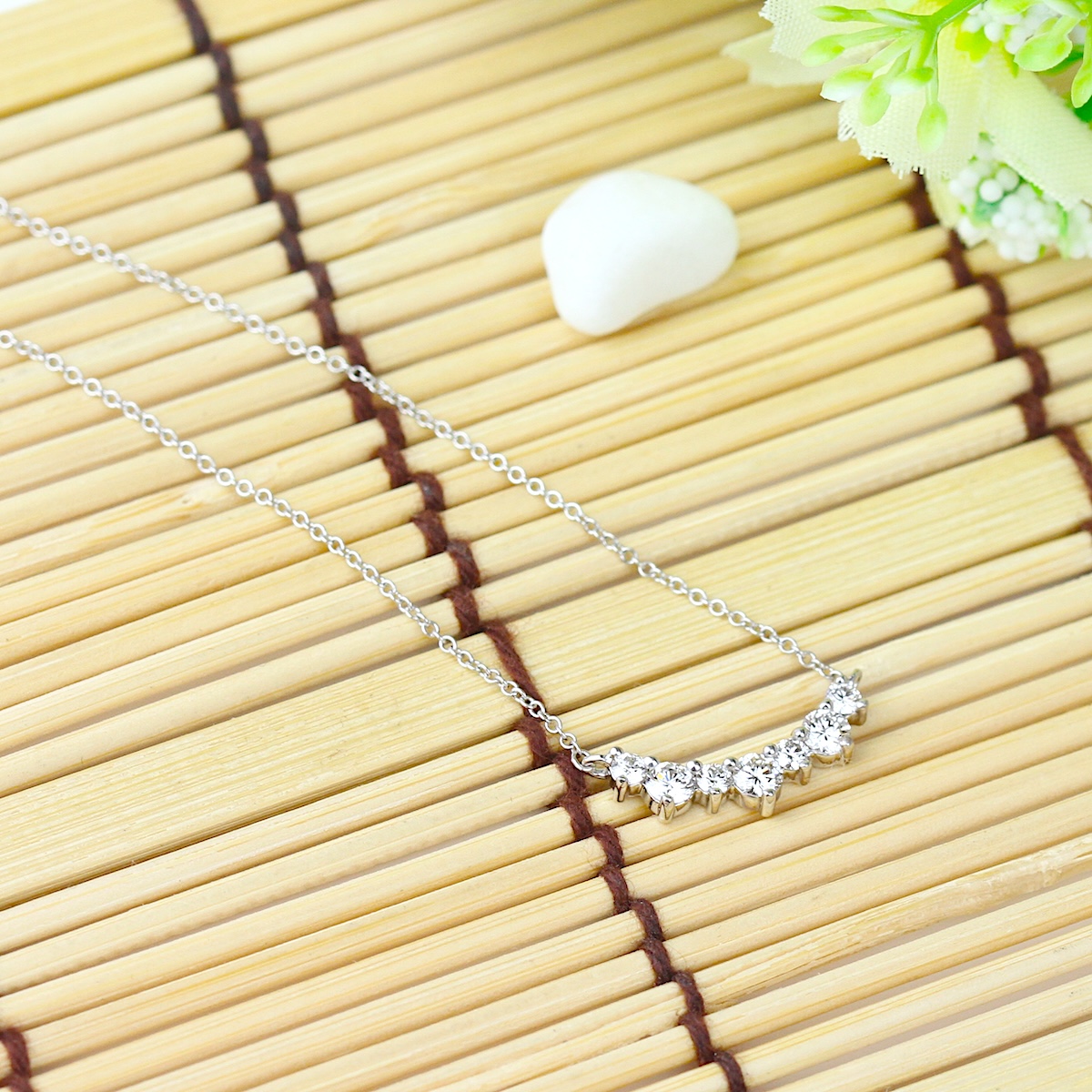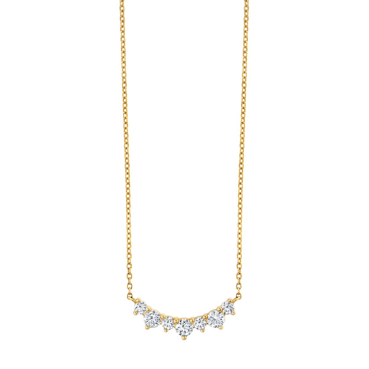 A delicate chain necklace features a softly curved row of graduating diamonds arranged in a gentle point along the neckline.
