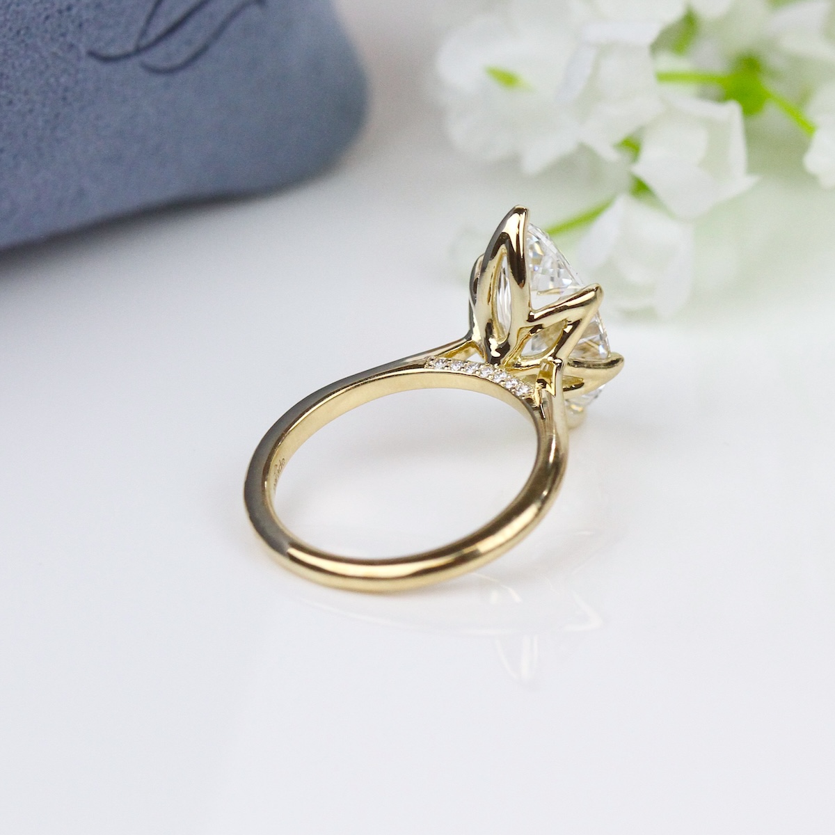 A marquise center diamond is set in a classic four-prong setting with a subtle hidden diamond accent beneath the crown.